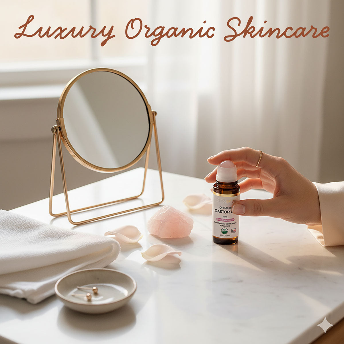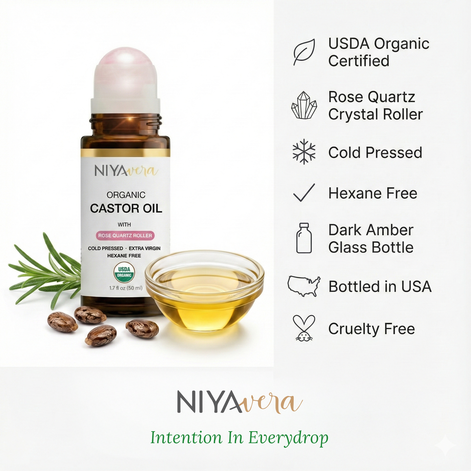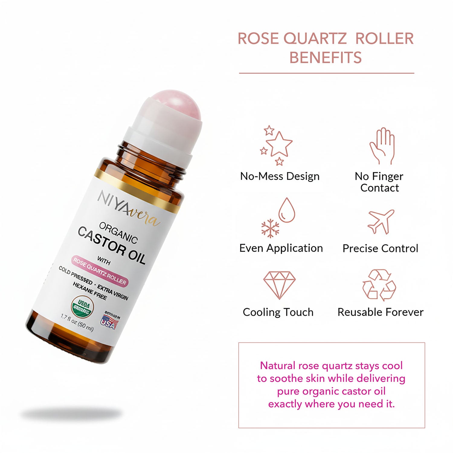 Niyavera Organic Castor Oil Roll on with Rose Quartz For Face and Body - Cold Pressed Hexane Free Glass Bottle Unrefined